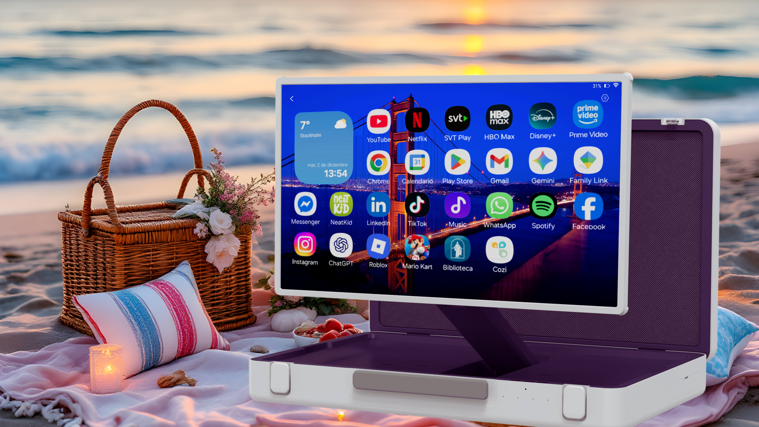 The ultimate 27” portable smart display designed to travel with you. With a sleek briefcase-style build, touchscreen technology, Android system, full access to Google Play Store, and integrated speakers, it transforms any environment into the perfect space for entertainment, work, or study.